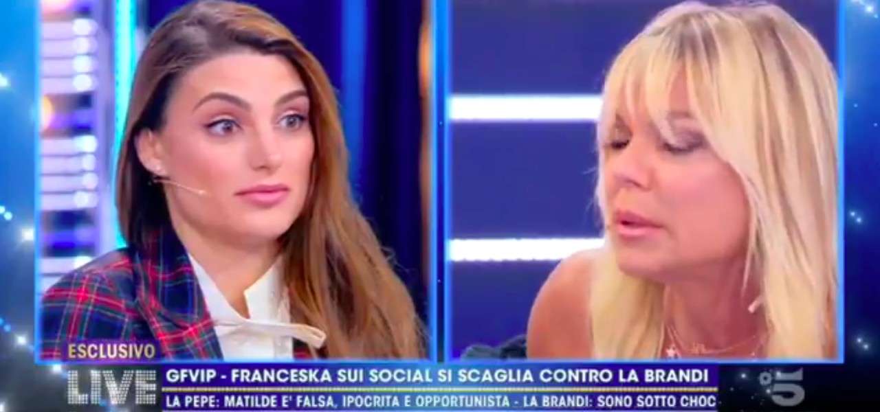 Franceska Pepe e Matilde Brandi hanno avuto un acceso confronto nell’ultima puntata di “Live non è la d’Urso”, andata in onda ieri sera, domenica 15 novembre 2020, in prima serata su Canale 5. Le due ex gieffine hanno avuto uno scontro verbale dietro le quinte del Grande Fratello Vip 5 sfociato poi sui social. La Brandi, con la voce rotta dal pianto, ha cercato di chiarire la situazione soprattutto per tutelare le sue figlie, Aurora e Sofia. “Ascoltami ti parlo con il cuore in mano, non puoi dire cose non vere, io ho due figlie, che purtroppo stanno vivendo un momento brutto. Sono delle cose gratuite che tu dici. Io non ho mai detto nulla in puntata contro di te, non ho mai fatto facce, nella casa ti ho sempre rispettato”, ha detto con le mani giunte la ex stella del Bagaglino. Franceska Pepe non ha interrotto la Brandi, ma le sue espressioni non lasciavano dubbi su ciò che pensasse.