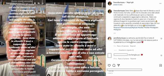 “Continuerò a segnalare e aggiungere a denuncia. Fatevi una ragione di vita e lasciate la nostra in pace. Non vi ha detto il dottore di seguirmi ne giudicare ogni nostro avvenimento. Trovate la vostra serenità e smettete di nascondervi, fake che non siete altro. La mia famiglia non si tocca”, ha concluso.