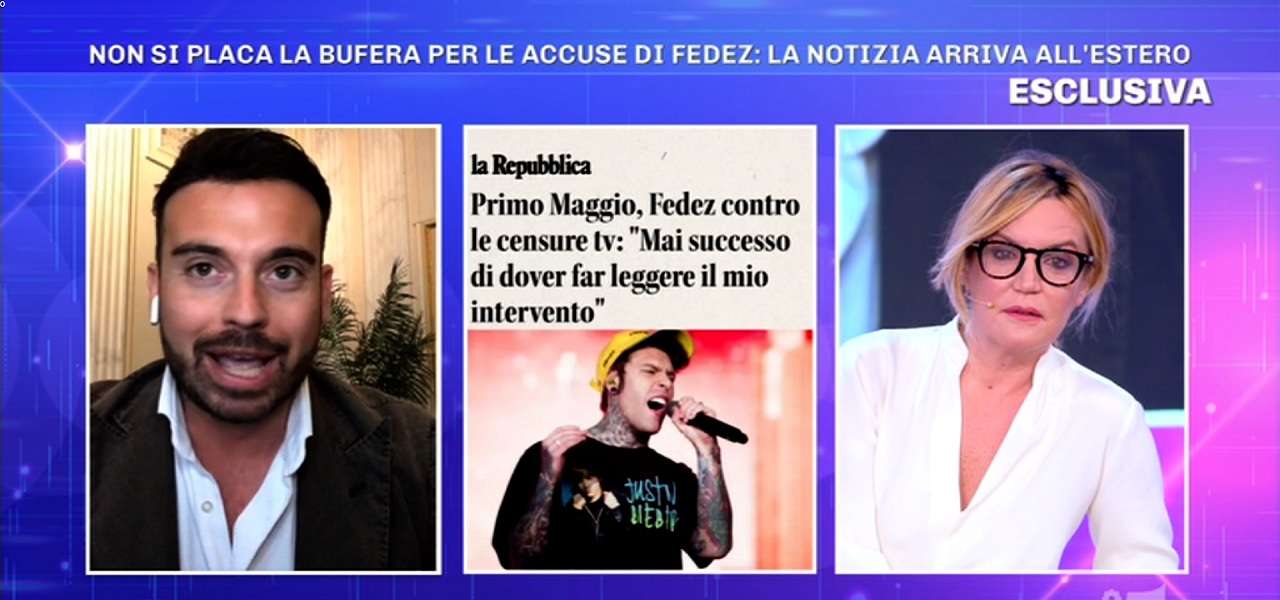 Patrizia Groppelli attacca il giornalista a Pomeriggio 5: “Ma se registrassero le tue telefonate e poi le pubblicassero, finiresti anche tu nei casini! – dice a Fredella, per poi precisare – È sacrosanto quello che ha detto Fedez ma non lo è stato il fatto che abbia registrato e pubblicato la telefonata!” Il giornalista replica però a tono alle insinuazioni: “Non ho nulla da nascondere! Probabilmente le mie telefonate le hanno già registrate. – poi, tornando a Fedez, conclude – E comunque non è sacrosanto che in un concerto del 1 maggio venga chiesto prima il testo ad un cantante, è una cosa che non si può sentire, neanche nel Medioevo!”