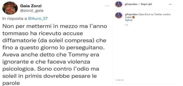 Per Gaia Zorzi, Soleil Sorge dovrebbe controllare il tono e soprattutto le parole che usa nelle discussioni. “Non per mettermi in mezzo, ma l’anno scorso, Tommaso ha ricevuto accuse diffamatorie (da Soleil compresa) che fino a questo giorno lo perseguitano. Aveva anche detto che Tommy era ignorante e che faceva violenza psicologica. Sono contro l’odio, ma Soleil in primis dovrebbe pesare le parole”, ha scritto la Zorzi rispondendo ad un’utente.