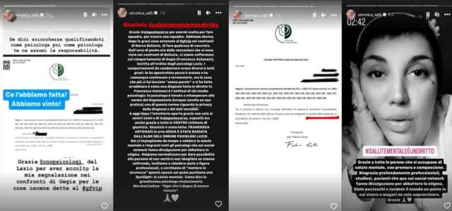 “Giustizia! Grazie Alessia Pontecorvo per avermi scelta per fare squadra, per essere una squadra. Abbiamo deciso, dopo le gravi cose avvenute al #gfvip nei confronti di Marco Bellavia, di fare qualcosa di concreto. Nell’arco di poche ore dalle vessazioni che si sono viste nei confronti di Bellavia. Ci siamo soffermate sul comportamento di Gegia (Francesca Antonaci), iscritta all’ordine degli psicologi Lazio. I comportamenti da condannare erano diversi e tutti gravi: lo ha apostrofato pazzo e malato e ha comunque continuato a tormentarlo, ma la cosa che più ci ha lasciate “senza parole” e ci ha fatte arrabbiare è stata una diagnosi fatta in diretta tv”, scrive Veronica Satti.