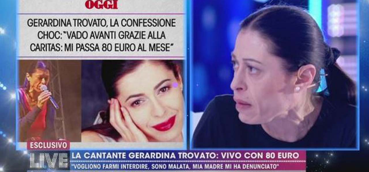a “Live Non è la D’Urso” nella puntata di oggi per raccontare il suo dramma. La cantautrice si confesserà parlando della sua grave situazione, non solo economica, visto che vive in Sicilia, con 80 euro al mese, andando avanti grazie all’aiuto della Caritas. Inoltre avrebbe superato le sue dipendenze dai farmaci, ma c’è un altro problema. «Vogliono farmi interdire». Poi c’è la grande delusione per essere stata esclusa dal Festival di Sanremo, che poteva rappresentare una chance di rinascita dopo depressione, malattie e debiti. Dunque l’ennesima sconfitta. Un racconto choc, dunque, quello di Gerardina Trovato, che nei giorni scorsi ha parlato della sua situazione in un’intervista a Il Messaggero. La rottura con la casa discografica di Caterina Caselli ha coinciso con il suo allontanamento dalla madre. «Non vuole aiutarmi perché dice che ho bruciato tutto con la droga e i vizi, ma non è vero. Ora devo chiedere aiuto agli estranei», ha raccontato la cantautrice siciliana di 52 anni.