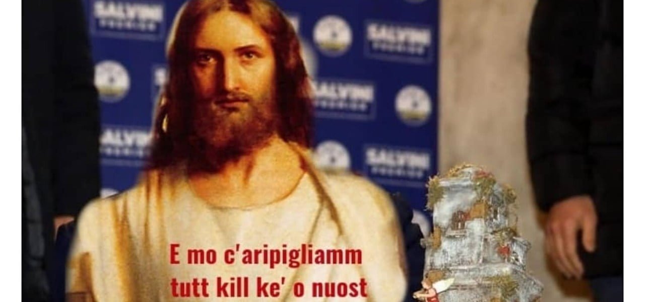 Un Gesù “sovrapposto” alla faccia di Salvini con il presepe all’ingresso del congresso di ieri della Lega con una citazione “d’eccezione”: «E mo ce ripigliamm’ tutt’ chell che è ‘o nuost», l’iconico “E adesso ci riprendiamo tutto quello che è nostro” di Gomorra, il romanzo e la serie scritte da Roberto Saviano, il grande nemico del leader leghista. Ecco, non è una scena di satira e neanche un attacco in piazza delle Sardine anti-Lega: no, è quello che è apparso per alcune ore sui canali social della Lega salvo poi accorgersi della gaffe e cancellando quando ormai la polemica era esplosa. Tra i leghisti infuriati per l’ironia blasfema, proprio il giorno dopo aver ribadito dal palco di Milano la profonda sintonia con i valori e la tradizione del cristianesimo ma ovviamente anche nelle opposizioni che non hanno perso l’occasione si sottolineare la gaffe dell’account Lega, per di più doppia per aver anche citato il “nemico” Saviano. «Apprendo che per la Lega di Salvini Gesù era un camorrista napoletano», scrive un utente su Twitter mentre altri sottolineano la bestemmia non tanto velata.