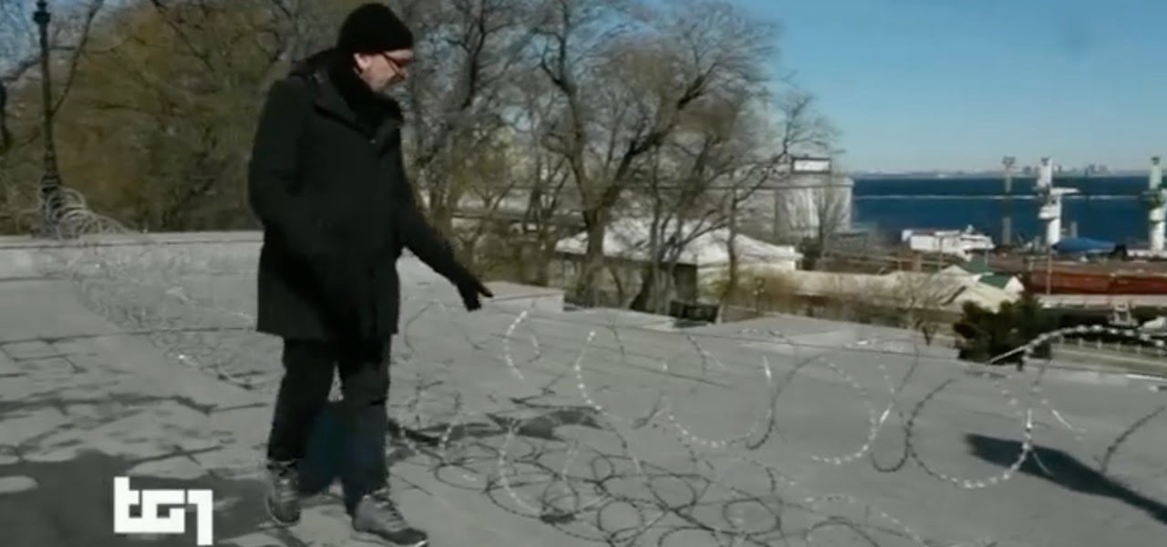 L’inviato ha mostrato il filo spinato che interrompe la scalinata a metà, chiudendola al pubblico. Poi ha raccontato: “Su questi scalini Odessa si ribellò ai bolscevichi nel 1905”. Nel frattempo sono passate le immagini del film di Sergej Ėjzenštejn, “La corazzata Potëmkin”, che in Italia è noto in particolare per la citazione cult in un film di Fantozzi.