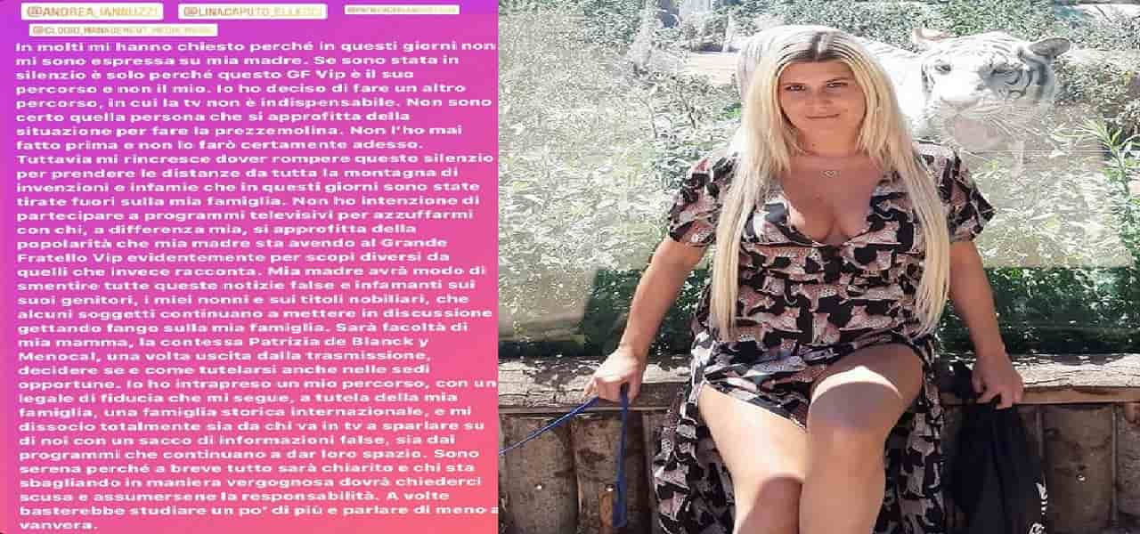 Giada De Blanck rompe il silenzio. Da giorni il titolo nobiliare della contessa Patrizia De Blanck è al centro di rumors secondo i quali la contessa, attualmente nella casa del Grande Fratello Vip 2020, non sarebbe una vera contessa e sarebbe, in realtà, la nipote di Mussolini. Dopo aver deciso di non intervenire a nessuna trasmissione televisiva lasciando il proprio spazio alla madre, Giada De Blanck ha commentato le ultime notizie attraverso un lungo post pubblicato su Instagram. Dopo aver spiegato di essere stata in silenzio perchè il Grande Fratello Vip è il percorso della madre Patrizia e non il suo, Giada aggiunge di aver deciso d’interrompere tale silenzio “per prendere le distanze da tutta la montagna d’invenzioni e infamie che in questi giorni sono state tirate fuori sulla mia famiglia“. Giada, inoltre, spiega che non parteciperà a nessuna trasmissione televisiva “per azzuffarmi con chi, a differenza mia, si approfitta della popolarità che sta avendo mia madre al Grande Fratello Vip evidentemente per scopi diversi da quelli che invece racconta”.