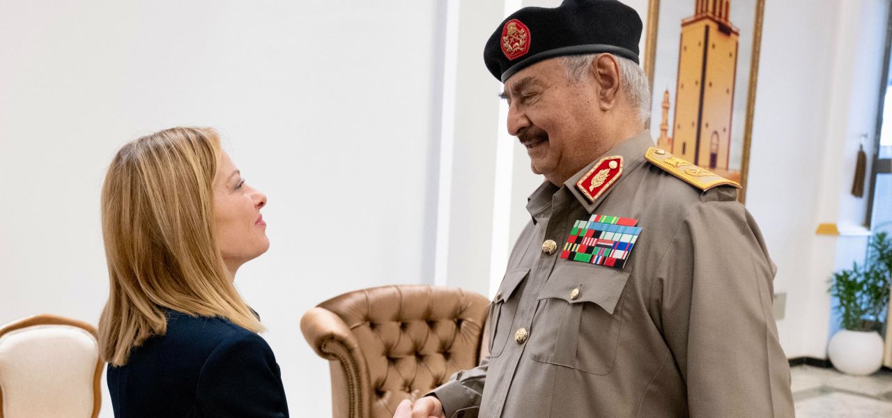 Giorgia Meloni con il generale Khalifa Haftar (Ansa)
