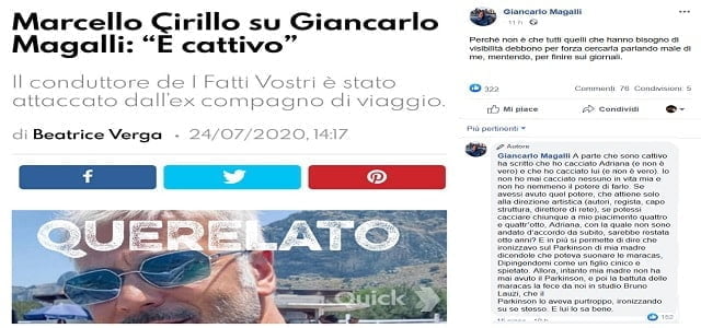 Sarebbero state alcune dichiarazioni di Marcello Cirillo ad aver infastidito Giancarlo Magalli che avrebbe così deciso di difendersi non con un’intervista, ma con un’azione legale. A svelare tutto è il conduttore che, in un lungo commento scritto sotto il suo post, svela ai fan tutti i motivi della querelle contro Cirillo. “A parte che sono cattivo ha scritto che ho cacciato Adriana (e non è vero) e che ho cacciato lui (e non è vero). Io non ho mai cacciato nessuno in vita mia e non ho nemmeno il potere di farlo. Se avessi avuto quel potere, che attiene solo alla direzione artistica (autori, regista, capo struttura, direttore di rete), se potessi cacciare chiunque a mio piacimento quattro e quattr’otto, Adriana, con la quale non sono andato d’accordo da subito, sarebbe restata otto anni?”, ha scritto Magalli rivolgendosi agli utenti. Magalli, poi, aggiunge ulteriori dettagli al suo risentimento nei confronti di Marcello Cirillo che lo avrebbe accusato di ironizzare “sul Parkinson di mia madre dicendole che poteva suonare le maracas dipingendomi come un figlio cinico e spietato”. Infine, il conduttore de I Fatti Vostri spiega che la madre non ha mai avuto il Parkinson e che la “battuta sulle maracas” la fece Bruno Lauzi che, purtroppo, quella malattia l’aveva davvero. Come risponderà Marcello Cirillo?