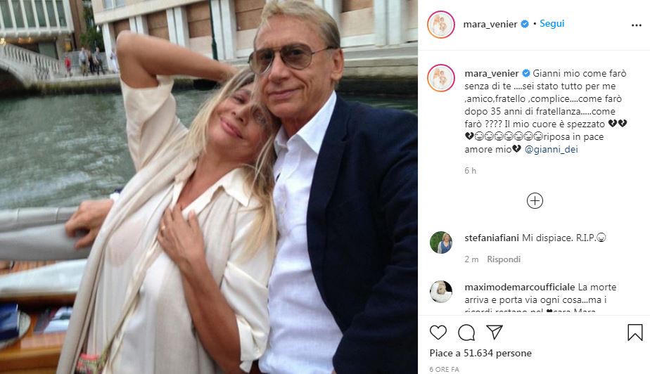 E’ morto Gianni Dei, poliedrico artista bolognese. L’attore e cantante è deceduto quest’oggi, 19 ottobre 2020, all’età di 79 anni. Numerosi gli pseudonimi utilizzati in carriera da Dei, come ad esempio Gianni Dei Carpanelli, Nino Dei e John Day, tutti nomi riconducibili ad un uomo dalla carriera artistica decisamente variegata, visto che Dei ha spaziato dal cinema alla musica, ed è stato fra i protagonisti di molte pellicole definite B Movie. Numerosi i personaggi dello spettacolo che hanno voluto omaggiare Dei, dedicandogli un messaggio di cordoglio e di affetto, e fra i primi Mara Venier, nota conduttrice di Domenica In, che attraverso la propria pagina Instagram ha scritto, a corredo di una bell’immagine dei due abbracciati: “Gianni mio come farò senza di te ….sei stato tutto per me, amico, fratello, complice….come farò dopo 35 anni di fratellanza…..come farò ???? Il mio cuore è spezzato riposa in pace”.