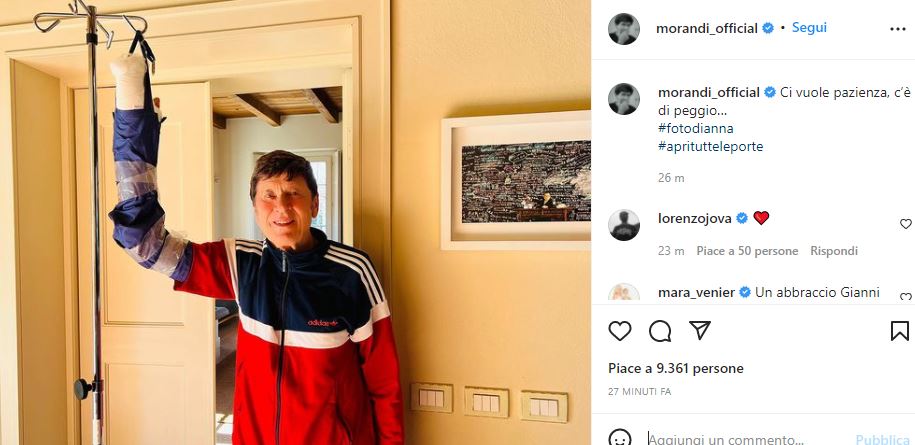 Numerosi i commenti di pronta guarigione a cominciare da quello, immancabile, dell’amico Jovanotti, che ha postato un cuore, mentre Mara Venier ha aggiunto: “Un abbraccio Gianni, apri tutte le porte”. Gianni Morandi ha invece mostrato l’ottimismo che lo contraddistingue da sempre, commentando il suo scatto con le parole: “Ci vuole pazienza, c’è di peggio…”. La notizia della nuova operazione era giunta come un fulmine a ciel sereno soltanto quattro giorni fa, quando lo stesso Gianni Morandi era stato costretto a interrompere il suo tour per appunto finire nuovamente sotto ai ferri.