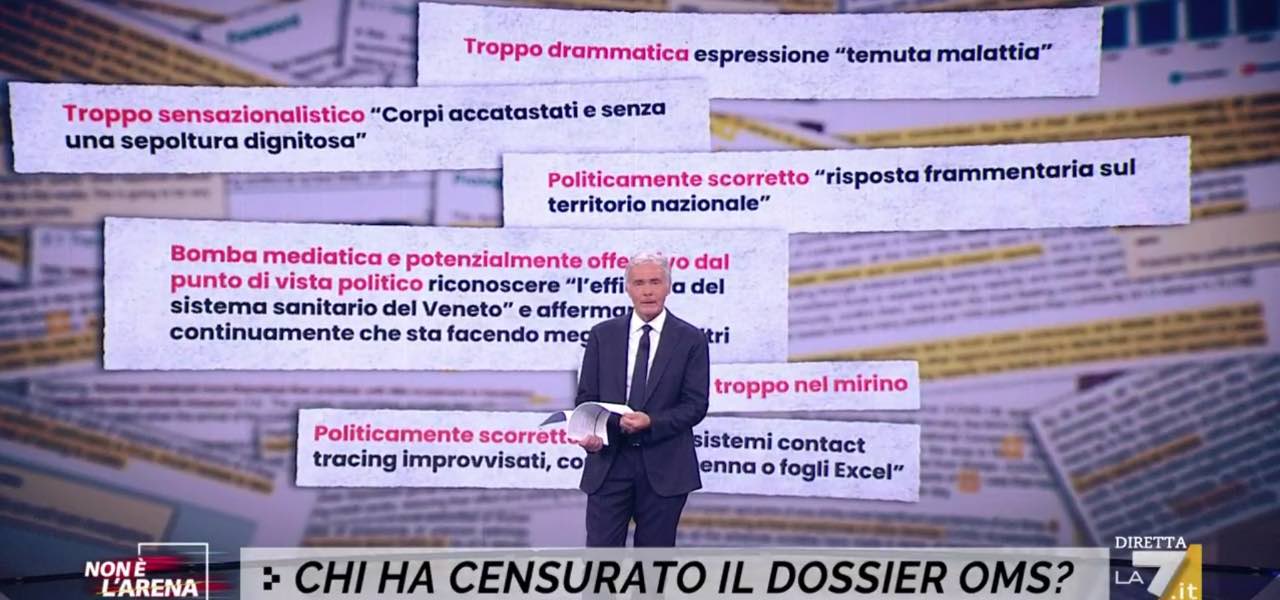 Ma Massimo Giletti a Non è l’Arena ha mostrato anche una chat tra Ranieri Guerra e Silvio Brusaferro, presidente dell’Istituto superiore di sanità, in cui il primo dice al secondo: «Ecco quanto emerso dalla riunione di ieri con Zaccardi e con Speranza a seguire. Se mi dai un paio di persone con cui interagire attacchiamo su tutti i fronti, soprattutto primariamente sul rapporto. Che ne dici?». Il conduttore ha poi letto una e-mail che Ranieri Guerra manda dopo quella riunione al direttore generale dell’Oms, Tedros Adhanom, in cui dice: «Il capo di gabinetto e il ministro concordano sul fatto che l’Istituto di superiore di sanità e il ministero della Salute formeranno un team per riscrivere la bozza».
