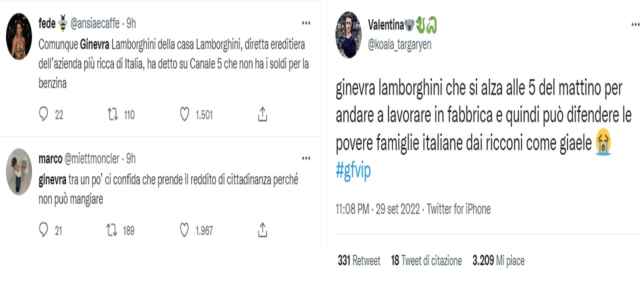 “Comunque Ginevra Lamborghini della casa Lamborghini, diretta ereditiera dell’azienda più ricca di Italia, ha detto su Canale 5 che non ha i soldi per la benzina”, scrive un utente. “Ginevra tra un po’ ci confida che prende il reddito di cittadinanza perché non può mangiare”, aggiunge un’altra. E ancora: “Ginevra Lamborghini che si alza alle 5 del mattino per andare a lavorare in fabbrica e quindi può difendere le povere famiglie italiane dai ricconi come Giaele“, scrive un’altra ragazza.