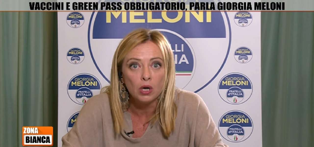 Giorgia Meloni a tutto tondo tra green pass e obbligo vaccinale ai microfoni di Zona bianca. «Io non sono favorevole all’obbligo vaccinale, soprattutto per i vaccini Covid. C’è una grande differenza tra questi vaccini e gli altri vaccini che prevedono l’obbligo: i vaccini anti-Covid hanno una autorizzazione condizionata, perché mancano alcune fasi della sperimentazione. Alcune fasi finiranno nel 2023, bisogna essere prudenti e valutare il rapporto rischio-beneficio», ha esordito la leader di Fratelli d’Italia. E non mancano le critiche al governo…