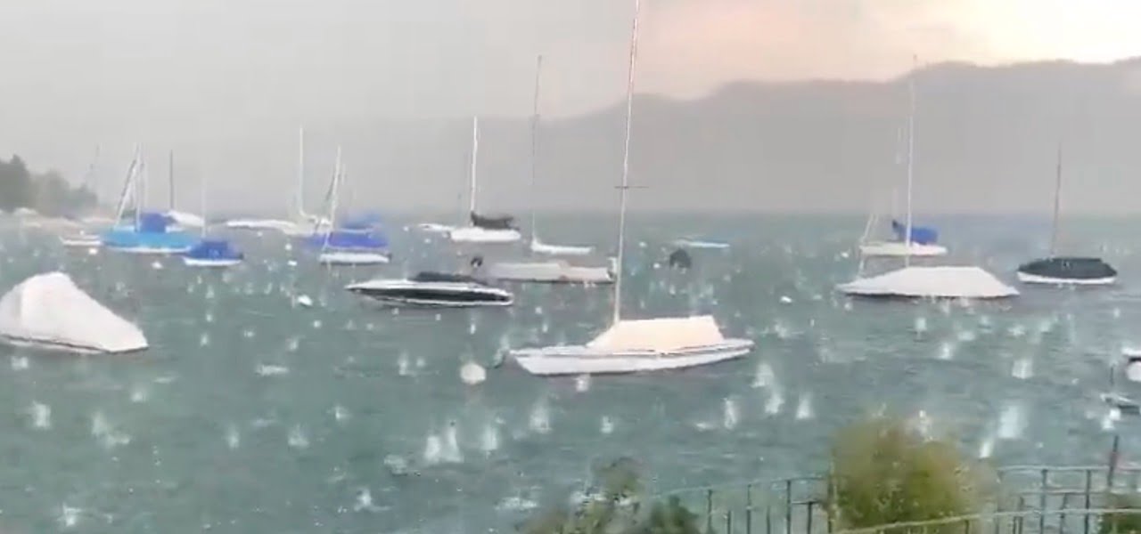 Uno dei numerosi video che sono stati registrati nel corso della violentissima grandinata in Francia mostra lo stato del Lago di Thun, che si trova in Svizzera proprio al confine con l’area più colpita del territorio francese. Le palle di ghiaccio di dimensioni fino ai 10 cm precipitano in acqua, affondando come se fossero dei veri e propri oggetti pesanti. Il tonfo sordo è ben udibile. Anche le barche presenti sono state colpite.