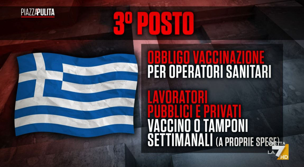 In quarta posizione il Canada, “Severissimo – spiegano da Piazzapulita – obbligo di vaccino per tutti i dipendenti pubblici entro ottobre e tutti gli over 12 entro novembre che vorranno viaggiare sui mezzi di trasporto. Al terzo posto la Grecia, molto simile a noi: obbligo di green pass per i lavoratori pubblici e privati, tampone a proprie spese”. Infine le prime due posizioni per severità: “Al secondo posto medaglia d’argento e ci siamo noi, poi al primo posto i paesi dove c’è l’obbligo di vaccinazione, Turkmenistan, Indonesia e Tagikistan”.