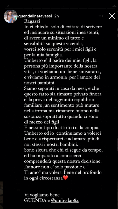 In tanti si sono chiesti quali fossero le motivazioni che hanno portato alla separazione dei due che, da tempo sono amatissimi dal pubblico del web. “Umberto sarà anche innamorato pazzo di me, ma se lo fosse certe cose non le farebbe. Questa è la mia verità.” ha fatto sapere Guendalina, alimentando il gossip sulla loro rottura.