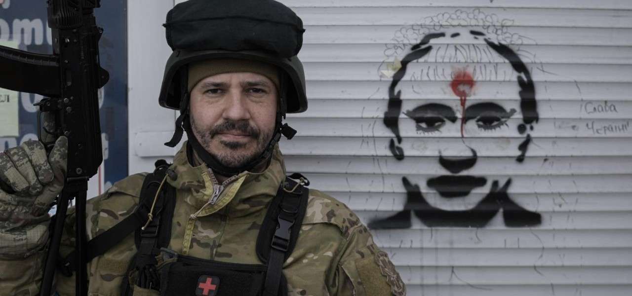Militare ucraino accanto a una caricatura di Putin (LaPresse)