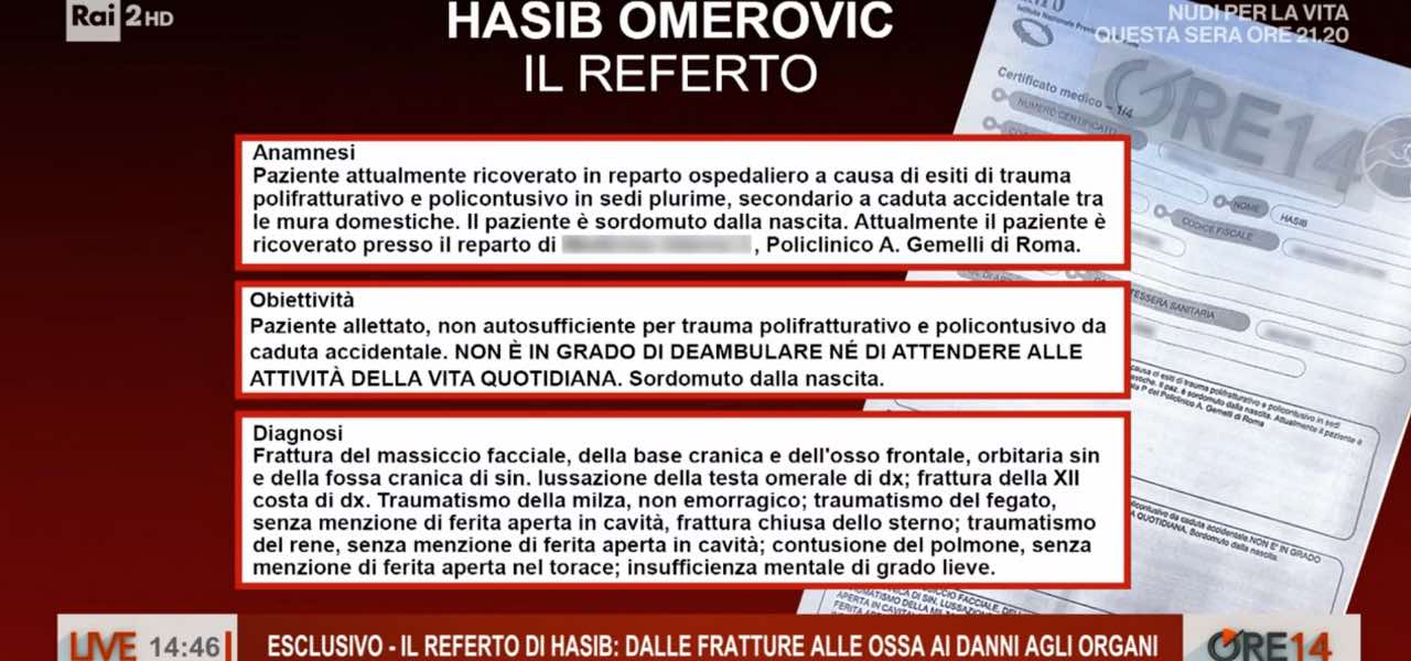 Il racconto della sorella di Hasib Omerovic, disabile psichica presente durante il fattaccio è del tutto divergente: ha parlato di botte e spiegato che il fratello è stato “afferrato per i piedi e buttato di sotto“. Altri elementi arrivano da Ore 14, che ha pubblicato in esclusiva il referto di ingresso in ospedale che chiarisce le condizioni di Hasib Omerovic. In anamnesi si parla di “esiti di trauma polifratturativo e policontusivo in sedi plurime, secondario a caduta accidentale tra le mura domestiche“.