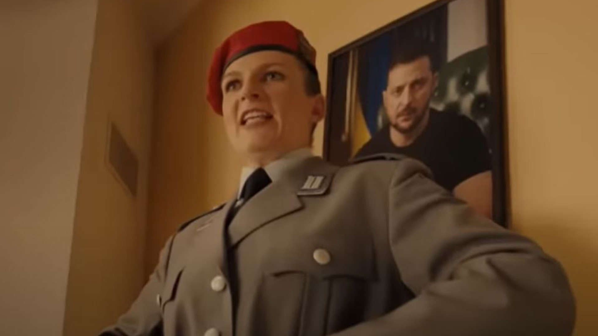 A quel punto la comandante appende una foto del presidente ucraino al muro per poi salutarla dicendo “Heil Zelensky!“, chiaro riferimento al saluto nazista. A fine video appare quindi una scritta in cui si legge: “La tua casa è nella Nato? Accetta la Nato in casa tua”, venendo poi forniti una serie di dati, ovvero, dall’inizio del 2022, da quando cioè è stata invasa l’Ucraina, più di 22 miliardi di euro “sono affluiti dal bilancio tedesco all’Ucraina”, cosa che comunque non corrisponde al vero.