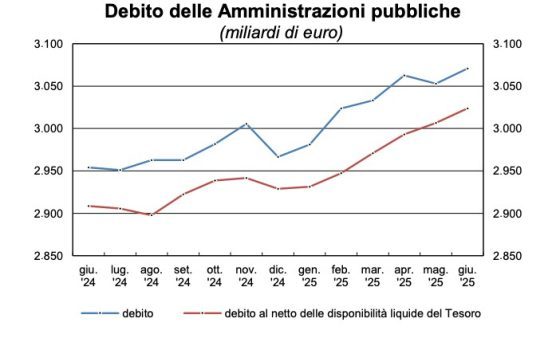 Il debito pubblico dell’Italia, calcolato secondo i criteri del Trattato di Maastricht, è arrivato alla fine del mese di giugno scorso a 3.071 miliardi di euro, secondo le rilevazioni mensili sul debito e il fabbisogno effettuate dalla Banca d’Italia e appena pubblicate. La barriera dei 3 mila miliardi era stata superata lo scorso febbraio, mentre alla fine del 2023 il debito si attestava a 2.870 miliardi, esattamente 200 in meno rispetto al dato attuale.