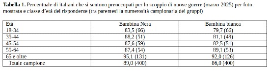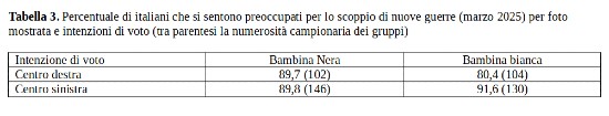 Si nota una preoccupazione per le guerre che cresce con l’età dei rispondenti, essendo importante ma bassa tra i giovani, intermedia tra le persone delle età di mezzo e massima tra gli anziani, ma la foto della bambina di pelle scura è sistematicamente più evocativa di preoccupazione rispetto a quella della bambina con la pelle chiara.