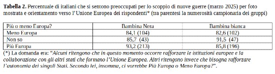 Tabella 2. Percentuale di italiani che si sentono preoccupati per lo scoppio di nuove guerre (marzo 2025) per foto mostrata e orientamento verso l’Unione Europea dei rispondenti* (tra parentesi la numerosità campionaria dei gruppi)
