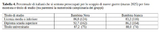 Tabella 4. Percentuale di italiani che si sentono preoccupati per lo scoppio di nuove guerre (marzo 2025) per foto mostrata e titolo di studio (tra parentesi la numerosità campionaria dei gruppi)