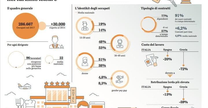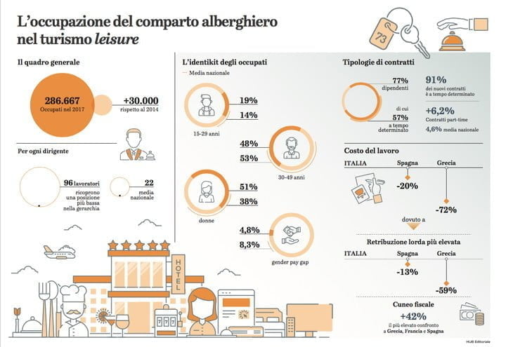 Negli ultimi cinque anni gli esercizi alberghieri hanno perso 394 unità, mentre sono esplosi quelli extra alberghieri (ad esempio ostelli, case per ferie ecc), +57.975, e quelli gestiti imprenditorialmente (camere o case in affitto ecc.), +38.836. Da questo divario deriva che dei 286.667 occupati di settore nel 2017, il 57% ha un contratto a tempo determinato, o part-time o con voucher, e il 7,6% ha un rapporto di lavoro familiare.