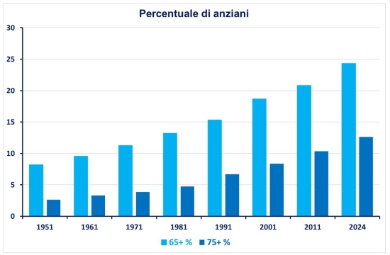 Merita innanzitutto discutere il concetto stesso di anziano, che analizziamo attraverso due classi di età: i soggetti con 65 o più anni di età e quelli con 75 o più anni: gli ultrasessantacinquenni, che erano poco più del 8% della popolazione nel 1951 sono diventati oltre il 24% nel 2024, mentre gli ultrasettantacinquenni sono passati dal 2,6% al 12,6% (Figura 1).