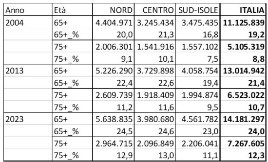 La tabella riporta anche i valori assoluti di anziani delle due classi di età, valore che è fondamentale per il dimensionamento dei servizi di assistenza, ed in particolare per i posti letto dedicati alla residenzialità: gli oltre 11 milioni di cittadini con 65 o più anni del 2004 sono diventati oltre 14 milioni nel 2023, mentre gli oltre 5 milioni con 75+ anni nel 2004 sono adesso più di 7 milioni.