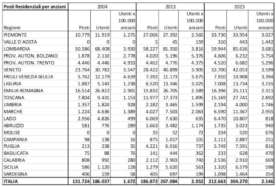 Tabella 2. Posti residenziali per anziani (65+), numero di utenti (65+), numero di utenti per 100.000 anziani. Dati per regione. Anni 2004, 2013, 2023. Fonte: Annuari statistici del Ministero della Salute.