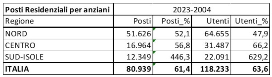 I letti disponibili e gli utenti sono quasi esclusivamente situati al Centro-Nord e mancano quasi completamente al Sud e nelle isole: nel 2004 la quota di posti del Meridione era del 2,1% ed è diventata del 7,1% nel 2023, quando invece la quota di anziani della stessa macroregione è sempre risultata superiore al 31%, chiaro indizio che nel Sud l’offerta dei servizi di residenzialità per anziani è molto carente. Si osservano variazioni di rilievo anche nelle regioni del Centro e del Nord ma non così estreme come nel Meridione.