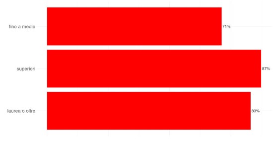 Figura 2. Percentuale di intervistati che ritengono che la temperatura media della terra sia salita negli ultimi 10 anni rispetto ai 10 anni precedenti, suddivisione per titolo di studio (dati inediti)