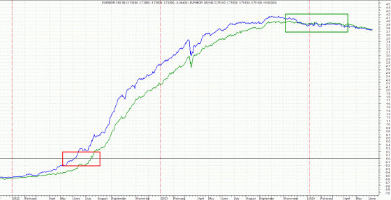 Complessivamente, sulla base delle rilevazioni di aprile, si può certamente confermare quella continuità ribassista iniziata al termine dello scorso anno che, su queste nostre pagine, evidenziavamo attraverso le osservazioni del mercato: «Le indicazioni che provengono dall’osservazione degli indici Euribor a 3 e 6 mesi sono eloquenti: il primo staziona in una fase di continua lateralità confinata a quota 3,90%, il secondo, distinguendosi, ha invertito la propria rotta ritracciando anch’esso a tali valori, ma, provenendo da precedenti massimi ampiamente al di sopra dei quattro punti percentuali. Un dato sicuramente a favore dei molti, moltissimi detentori di mutui a tasso variabile. Quanto meno in ottica futura».