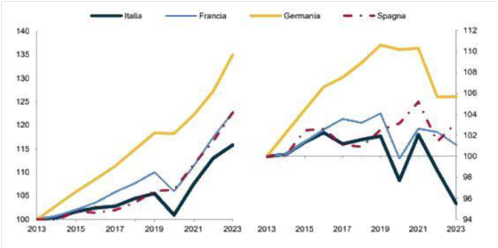 L’analisi delle retribuzioni in termini reali mostra poi un divario ancora più marcato rispetto alle altre economie europee: nel 2023 l’Italia era l’unico Paese con un livello medio delle retribuzioni reali inferiore rispetto a dieci anni prima.