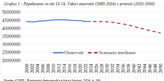 L’Italia attraversa una trasformazione demografica profonda, unica nella sua storia recente, che modifica in modo significativo la composizione della forza lavoro perché al progressivo invecchiamento della popolazione si aggiunge il consistente e persistente calo della natalità. Si tratta di fattori che comprimono progressivamente la popolazione in età lavorativa, con effetti rilevanti sulle dinamiche del mercato del lavoro e sulla sostenibilità del sistema economico e previdenziale.