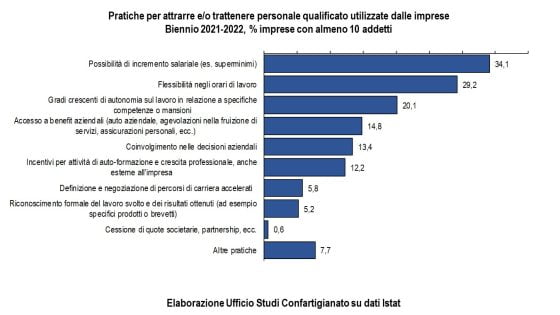 La reazione delle imprese – Oltre due imprese su tre (67,3%) hanno adottato interventi per attrarre e/o trattenere il personale qualificato. Più diffusi gli incrementi salariali, adottati dal 34,1% delle imprese, e la flessibilità negli orari di lavoro, registrata nel 29,2% dei casi. Inoltre, le imprese adottano la concessione di maggiore autonomia sul lavoro nel 20,1% dei casi, l’accesso a benefit aziendali (auto aziendale, agevolazioni nella fruizione di servizi, assicurazioni personali ecc.) nel 14,8% dei casi, il coinvolgimento nelle decisioni aziendali nel 13,1% dei casi, e incentivi per attività di auto-formazione e crescita professionale, anche esterne all’impresa, nel 12,2% dei casi.