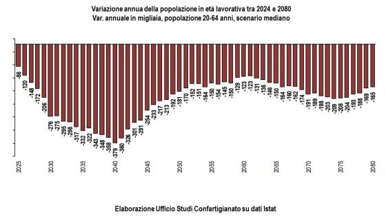 Considerando il totale della popolazione, l’Italia nei cinquant’anni tra il 2030 e il 2080 perderà in media annua 247 mila abitanti: come se al passare di ogni anno sparisse pressoché interamente la popolazione del comune di Venezia (251 mila abitanti).