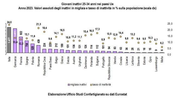 A fronte del calo demografico e la rarefazione del capitale umano, si registra il “grande spreco” rappresentato da un milione 477 mila giovani inattivi tra 25 e 34 anni (due su tre sono donne) che non si offrono sul mercato del lavoro, pari al 24,0% della rispettiva popolazione, di quasi dieci punti sopra alla media europea del 14,4%. In un caso su quattro (25,7%) i giovani inattivi sono in possesso di un diploma di laurea.