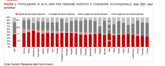 Il 43,4% della popolazione di età compresa tra 50 e 74 anni non percepisce una pensione ed è occupata, quasi 9 milioni di individui relativamente giovani, essendo l’età media pari a 56,3 anni. La quota è in linea con la media dell’Unione europea (43,2%). La percentuale dei pensionati tra i 50 e i 74 anni di età (32,1%) è invece tra le più basse in Europa, superiore solo a quelle di Spagna (24,3%), Danimarca (25,5%) e Grecia (31,7%), distanziandosi di oltre 8 punti percentuali dalla media Ue-27 (40,5%).
