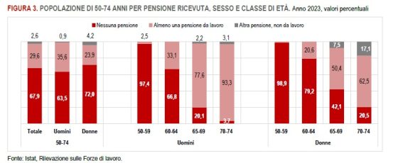 Tra i 50-74enni, coloro che ricevono una pensione da lavoro sono il 29,6%; la percentuale scende al 9,3% tra 50 e 64 anni e sale al 69,9% tra 65 e 74 anni. I percettori di pensione non derivante da una pregressa attività lavorativa, cioè i percettori di pensioni private ottenute a seguito di un piano pensionistico personale e i percettori di pensioni di reversibilità, invalidità e assegno sociale di età superiore ai 66 anni, rappresentano una quota residuale, pari al 2,6%, delle persone di età compresa tra i 50 e i 74 anni, quota che sale al 10,5% tra i 70-74enni (3,1% tra gli uomini e 17,1% tra le donne).