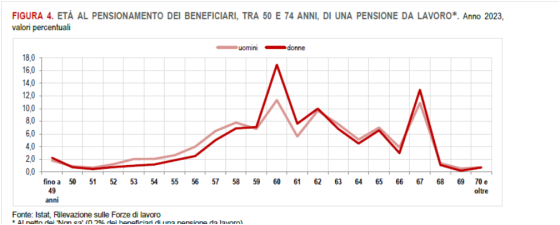 Tra i beneficiari di una pensione da lavoro tra 50 e 74 anni, l’età media al pensionamento è pari a 60,9 anni. Per effetto dei passati provvedimenti legislativi (in cui l’età legale al pensionamento era più bassa), delle norme più recenti che hanno introdotto misure di flessibilità in uscita (quota 100, 102 e 103) e delle anticipazioni alla pensione per i lavori usuranti o gravosi, la curva presenta dei picchi, soprattutto tra le donne, in corrispondenza delle età pari a 60 (13,7%) e 67 anni (11,8%);