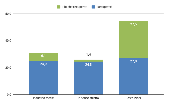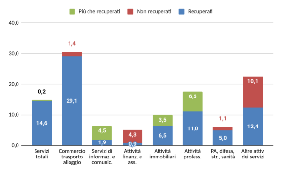 – Il settore del commercio, trasporti e alloggi era stato quello più colpito, perdendo ben 30 punti percentuali. Tuttavia 29 di quei 30 punti sono stati recuperati.
