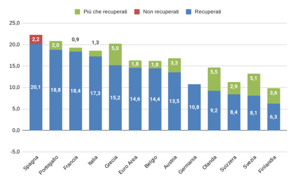 – tutti i restanti Paesi hanno conseguito un pieno recupero e tutti, tranne la Germania, anche una crescita addizionale. Per l’Italia essa è stata di 1,3 punti, un dato più elevato rispetto alle altre maggiori economie dell’Unione: Francia 0,9 punti, Germania zero.
