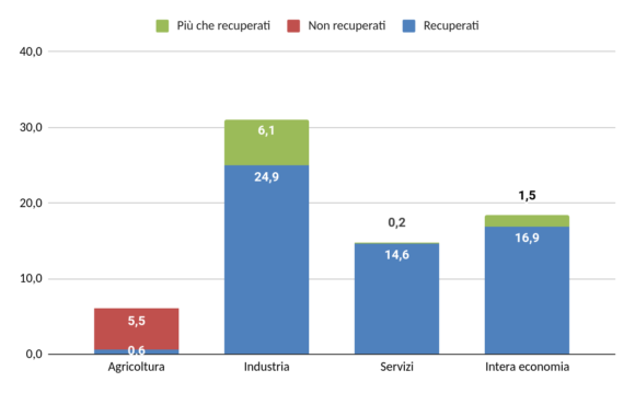 – Nella fase di ripresa, tuttavia, l’industria non solo ha recuperato tutta la caduta, ma vi ha aggiunto sei punti ulteriori di crescita, mentre i servizi hanno appena completato il recupero e l’agricoltura è rimasta al palo, non recuperando quasi nulla della caduta. Ma qui le ragioni, che andranno approfondite, non sono assolutamente legate al Covid e occorre invece chiederci quanto dipendano dalla siccità e dai drammatici cambiamenti climatici.