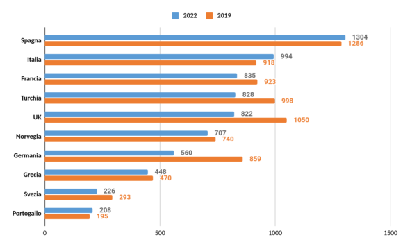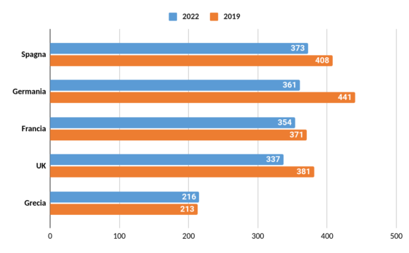 La differente velocità di ripresa che ha avvantaggiato l’Italia ha fatto recuperare posizioni in Europa al nostro mercato domestico, ora al secondo posto dopo quello spagnolo, come illustrato nel Grafico 2, mentre prima del Covid era solo il quinto.