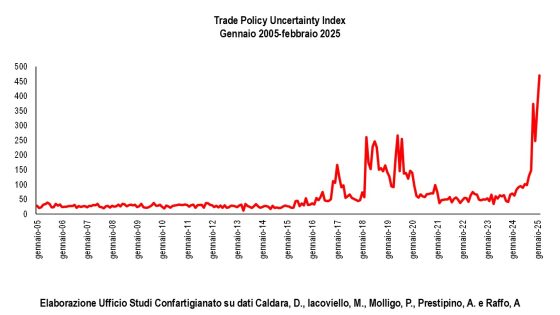 L’avvio della guerra dei dazi fa salire l’incertezza sugli scambi internazionali e l’indice di incertezza della politica commerciale a febbraio 2025 raggiunge un nuovo massimo storico.