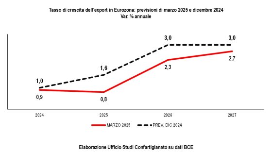 L’aumento dell’incertezza penalizza gli interscambi commerciali e riduce la crescita, con un impatto più pronunciato nell’area dell’euro. Nelle previsioni della Bce di marzo la crescita dell’export nell’Eurozona è dello 0,8%, in rallentamento rispetto al trend del 2024 (+0,9%) e dimezzata rispetto alle previsioni di dicembre 2024 (+1,6%).
