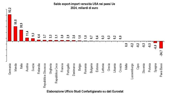 I dazi sono stati introdotti come conseguenza del disavanzo commerciale degli Usa nei confronti dell’Ue a 27. Nel 2024 l’Unione europea registra un avanzo commerciale con gli Stati Uniti di 198,2 miliardi di euro, pari all’1,1% del Pil. L’Italia presenta il terzo saldo import-export con gli Usa, pari a 38,9 miliardi di euro (1,8% del Pil), inferiore solo a quello di Germania (92,2 miliardi pari al 2,1% del Pil) e Irlanda (50,8 miliardi, il 9,5% del Pil). Gli Usa, dopo aver superato la Francia nel 2022, sono il secondo mercato del made in Italy dietro alla Germania, con esportazioni che nel 2024 valgono 64,8 miliardi di euro.