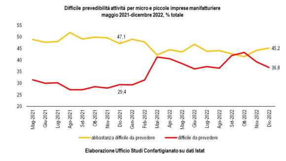 La manifattura inizia il 2023 all’insegna dell’incertezza. Oltre un terzo (36,8%) delle micro e piccole imprese (MPI) manifatturiere ritiene difficile da prevedere l’andamento futuro dei propri affari (era il 29,4% un anno prima) e il 45,2% lo ritiene abbastanza difficile da prevedere (47,1% un anno prima).