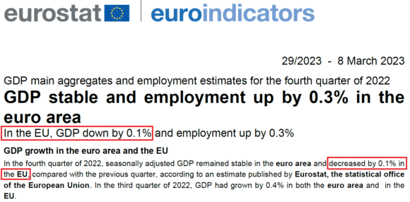 E proprio “quel soffio” richiama alla memoria il nostro recente zero-virgola che, abituandoci al suo ormai più frequente assistere (e udire), ci vede oggi in prima linea a obiettare su alcune dichiarazioni. Sulla principale, ovvero, quella che abbiamo già riportato e che vede professare tale scampato pericolo nelle parole del vicepresidente della Commissione Valdis Dombrovskis a seguito della pubblicazione di Eurostat sul Pil del quarto trimestre 2022.